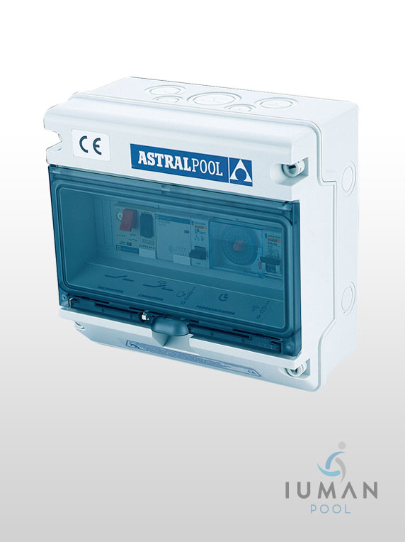 Dependiendo de la corriente nominal de la bomba de filtración se debe seleccionar el tipo de armario: Protección magnetotérmico (1,6 hasta 10A) contactor, reloj de programación 24 h. 3 posiciones Auto / 0 / manual. 230V 16A Salida protegida y controlada para luces.