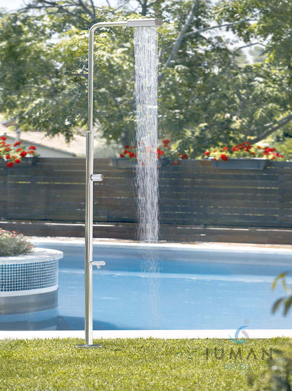 Ducha de acero inoxidable pulido AISI-304 (diámetro 43 mm) con 1 rociador antical cromado y una válvula de apertura caudal. Incluye grifo lavapiés. Con anclaje incorporado 00107.